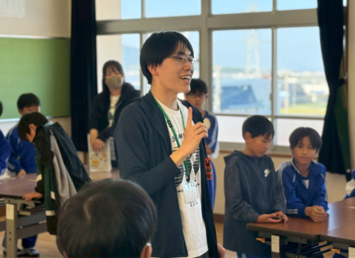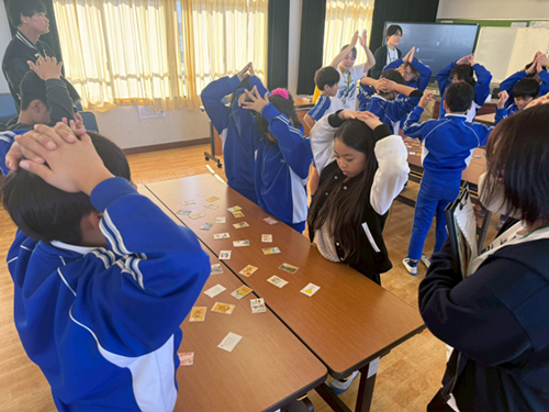 メインとなる活動は2日目16日に南あわじ市立小学校で行われた総合防災訓練での活動です。今年度は、新たに企画立案した「防災かるた」を、小学校4年生を対象にワークショップ形式で実践しました。「宮教大だからできること」を通して「楽しみながら考える」という方針のもと、読み上げられた内容が正しければとる、正しくなければとらないというルールを設け、東日本大震災の教訓や日頃の備えの重要性などを盛り込んだカルタを作成しました。実践の後半では、正誤を一概に判断できない災害時のジレンマをテーマとした札を通して、災害について考え続けることの重要性を訴えました。